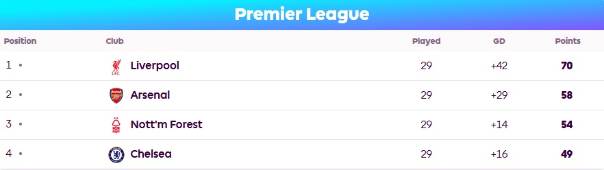 Top 4 Premier League hiện tại.Dưới đây là những trận đấu có thể định hình cả mùa giải:Liverpool vs Everton – Derby Merseyside căng thẳng tại AnfieldNếu Arsenal giành chiến thắng trước Fulham trước đó một ngày, khoảng cách giữa họ và Liverpool sẽ rút ngắn xuống dưới 10 điểm. Trong bối cảnh đó, trận derby Merseyside trở nên đặc biệt quan trọng. Everton từng cầm hòa Liverpool 2-2 ở lượt đi, và sẽ không gì tuyệt vời hơn với họ là tiếp tục ngáng đường đại kình địch.
