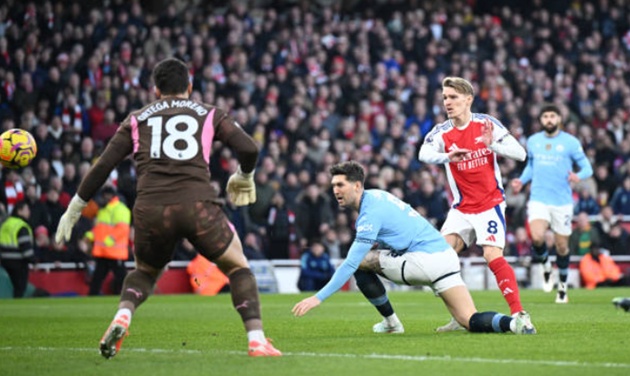 Odegaard mở tỷ số cho Arsenal sau sai lầm của hàng thủ Man City.Manuel Akanji xử lý lóng ngóng dưới sức ép từ Leandro Trossard, tạo điều kiện để Declan Rice cướp bóng và thực hiện pha chọc khe thông minh cho Kai Havertz. Tiền đạo người Đức không dứt điểm mà chuyền ngang để Martin Odegaard dễ dàng đệm bóng vào lưới trống.