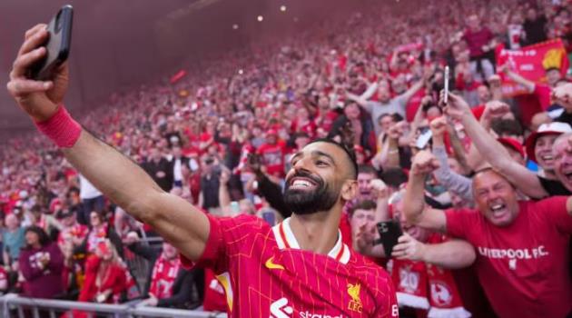 Salah ăn mừng cùng các cổ động viên Liverpool.Tiền đạo người Ai Cập đã ghi bàn trong chiến thắng 5-1 của Liverpool trước Tottenham tại Anfield vào Chủ nhật, giúp đội bóng đăng quang Premier League trước 4 vòng đấu. Bàn thắng này đã đưa Salah vượt qua Sergio Aguero để trở thành cầu thủ ghi bàn quốc tế hàng đầu trong lịch sử Premier League, đồng thời nâng tổng số bàn thắng của anh lên 33 bàn và 23 pha kiến tạo trên tất cả các đấu trường trong mùa giải này.